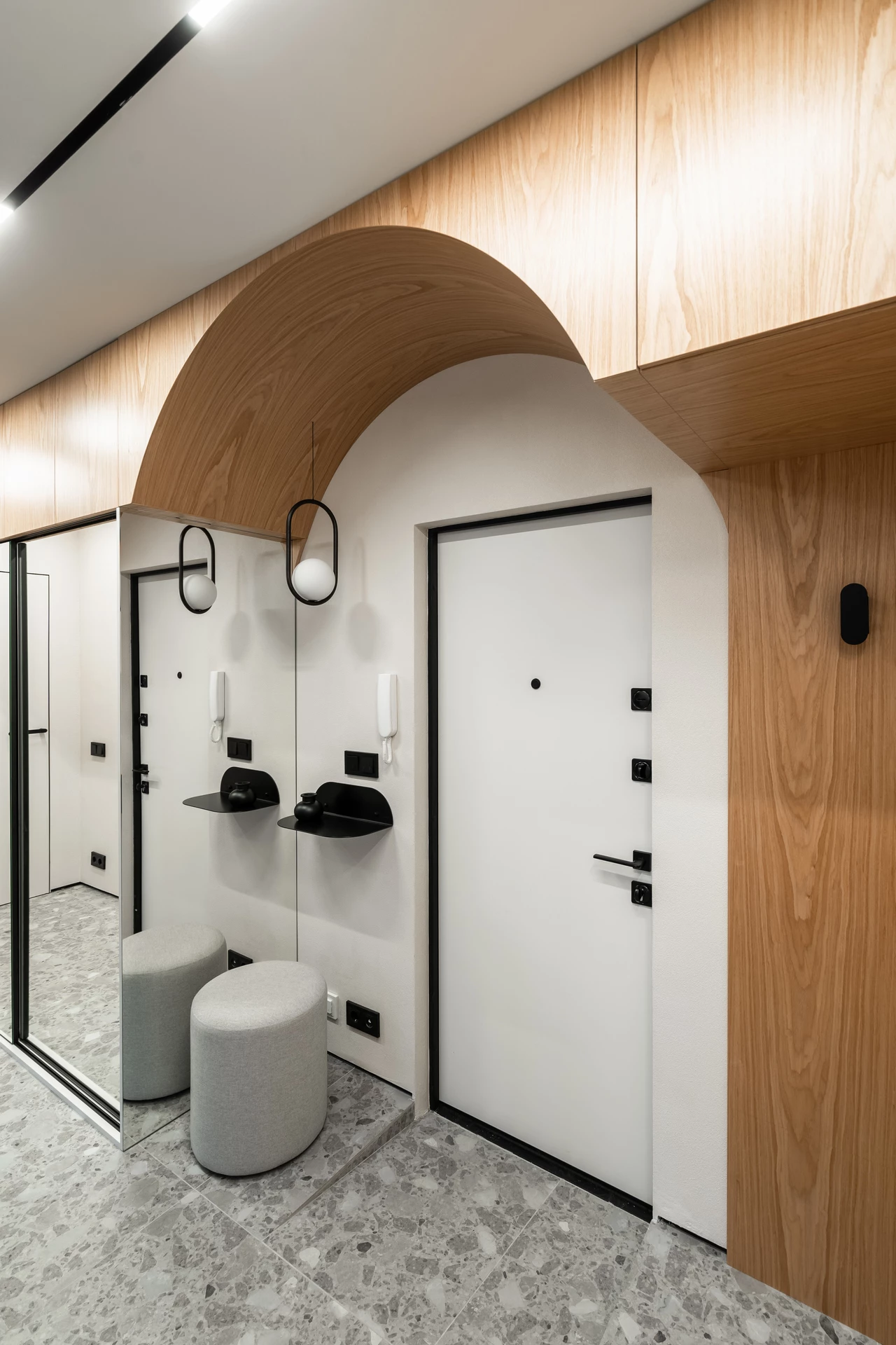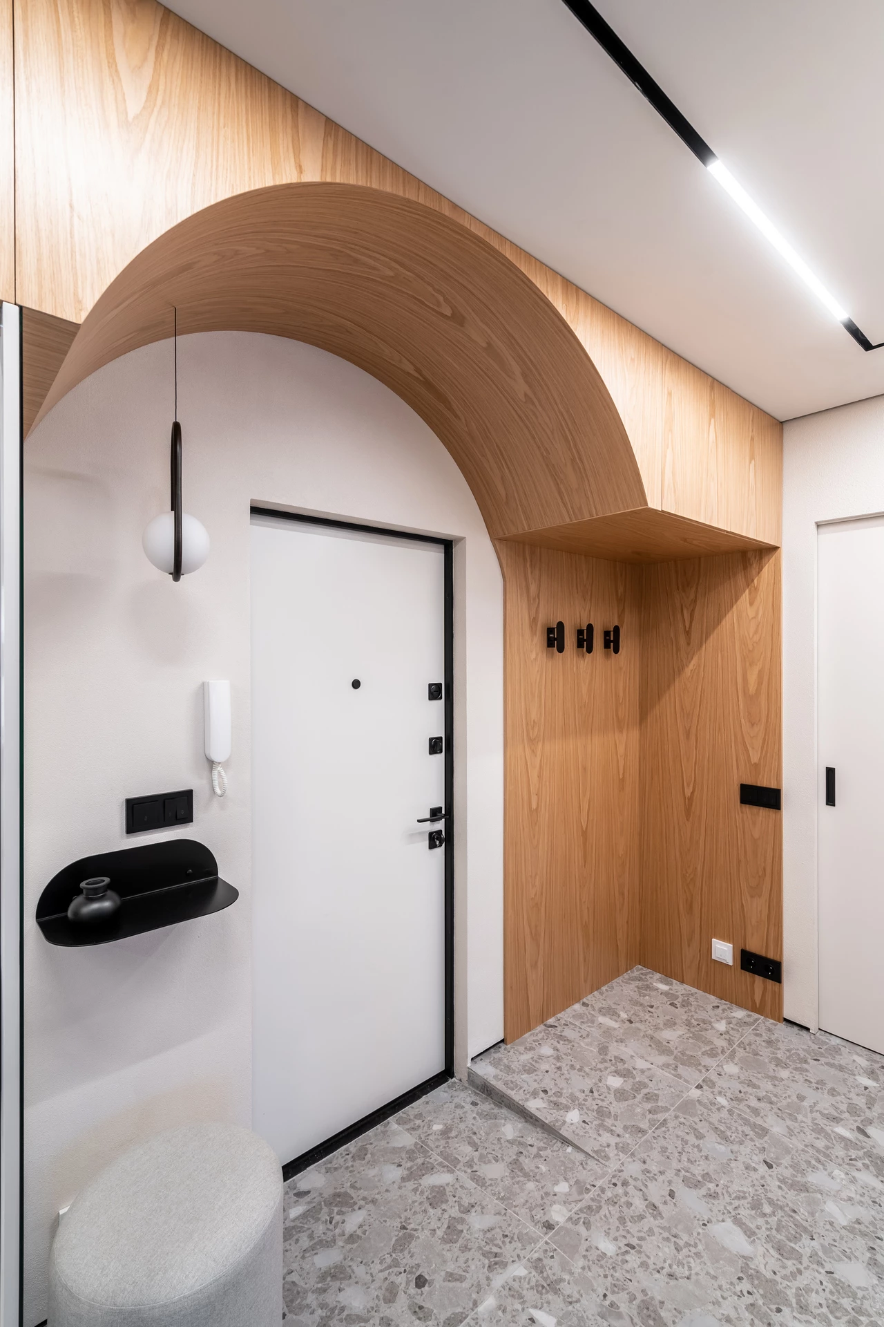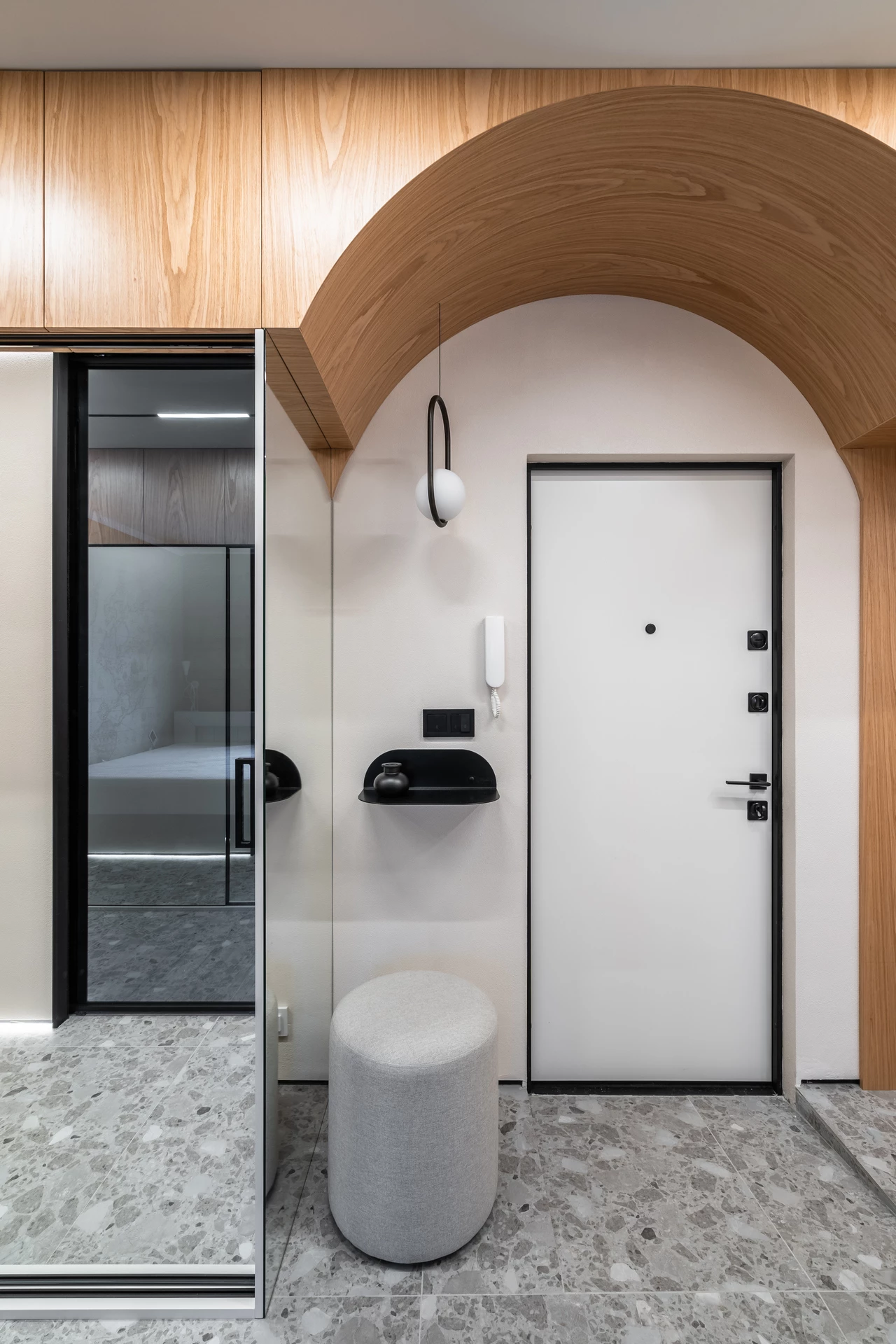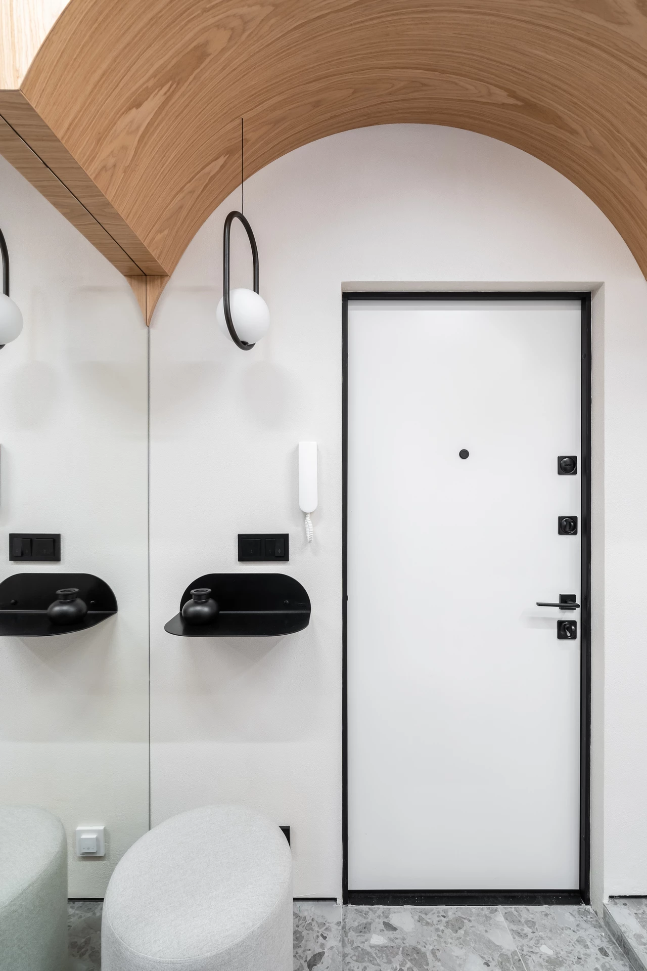 Для поддержания общей стилистики комнаты была выбрана модель в фирменном покрытии Soft Touch с матовой поверхностью и цветом заказчика внутри. Панель со стороны прихожей, в цвет основного интерьера, сочетается с выбранной стилистикой и помогает создать гармоничный интерьер прихожей.