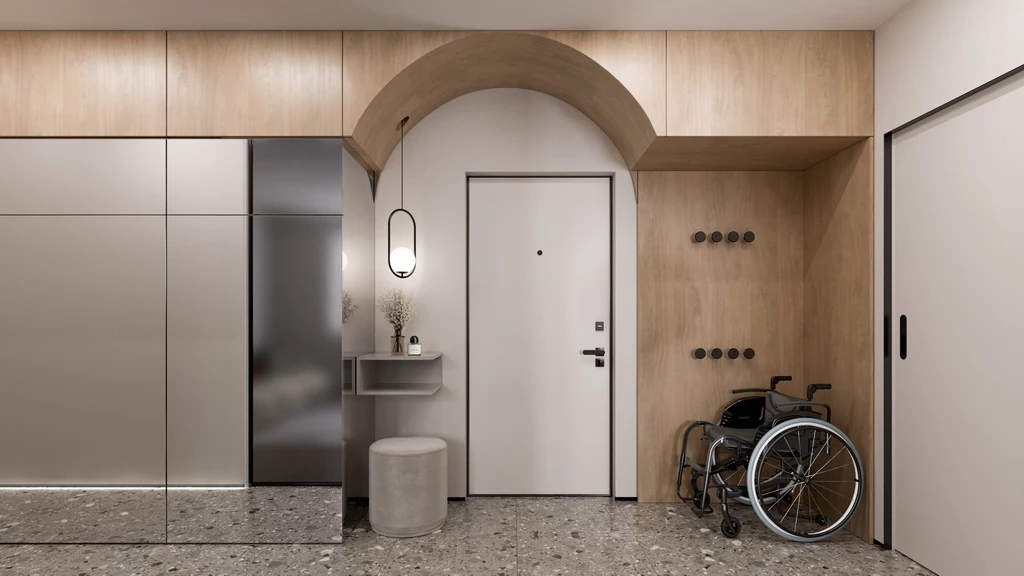 Входную дверь в квартире заменили. Новая, с минимальным порогом, поможет максимально убрать препятствия с пути Олега. Входная дверь 80 серии защитит и от шума, и от неприятных запахов из подъезда, а от непрошеных гостей уберегут итальянские замки Securemme высшего класса безопасности.
